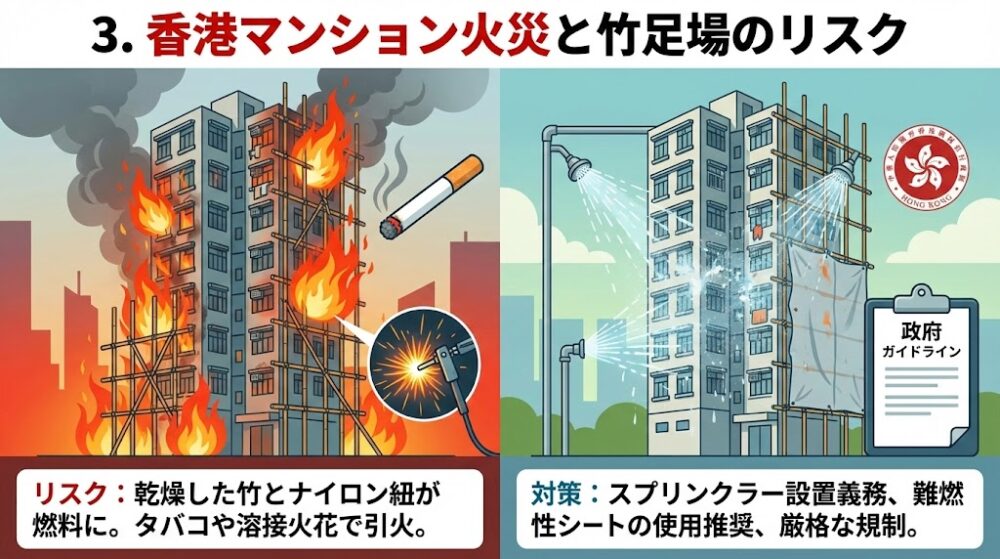 ニュース映像で火災を見ると恐怖を感じますが、竹の足場そのものは、狭く高温多湿な香港の環境に適応した、非常に優れた技術の結晶です。