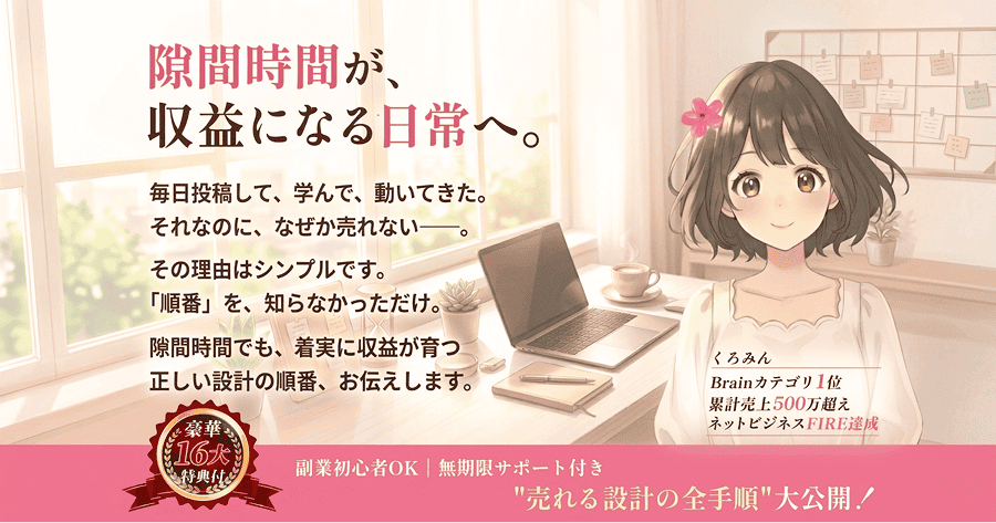 制作者である「くろみん」氏が、自身の挫折経験と成功者のノウハウ分析から導き出した「遠回りせずに自分で稼ぐ力」を身につけるためのエッセンスが詰め込まれています。